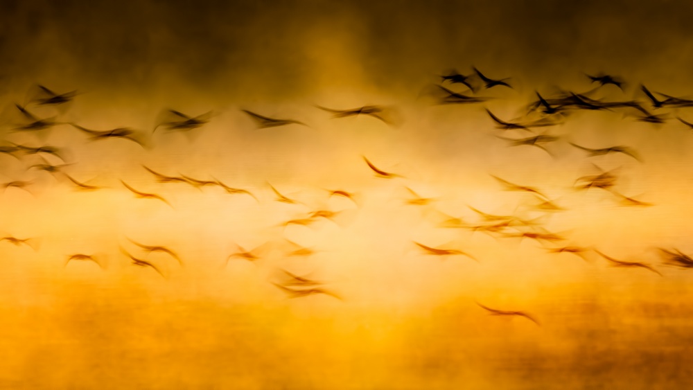 It was a chilly winter morning in New Mexico when I was photographing cranes and snow geese. The cranes had rested over a swamp area during the night. Light fog hovered over the water at dawn when the sun turned it into a steamy golden pond. I was immersed in the dreamy mood and asked myself - how do I enhance the dream? I envisioned an image in which birds fly over the water and they were blurry as if they were flying in a dream... My experience told me that the cranes would take off soon after the sunrise and they would take off in a direction that was against the wind. So I aimed the camera to the area in the predicted flight path of the cranes, set the manual focus at the distance I predicted, locked down the camera on the tripod, and used ISO200, F16, 1/6 second shutter speed. I have photographed cranes with slow shutter speed in many occasions. I knew that the cranes would appear blurry whilst still maintaining some detail at this speed. This was almost a typical technique I would use for landscape work, except I set the camera at a high-speed continuous shooting mode.